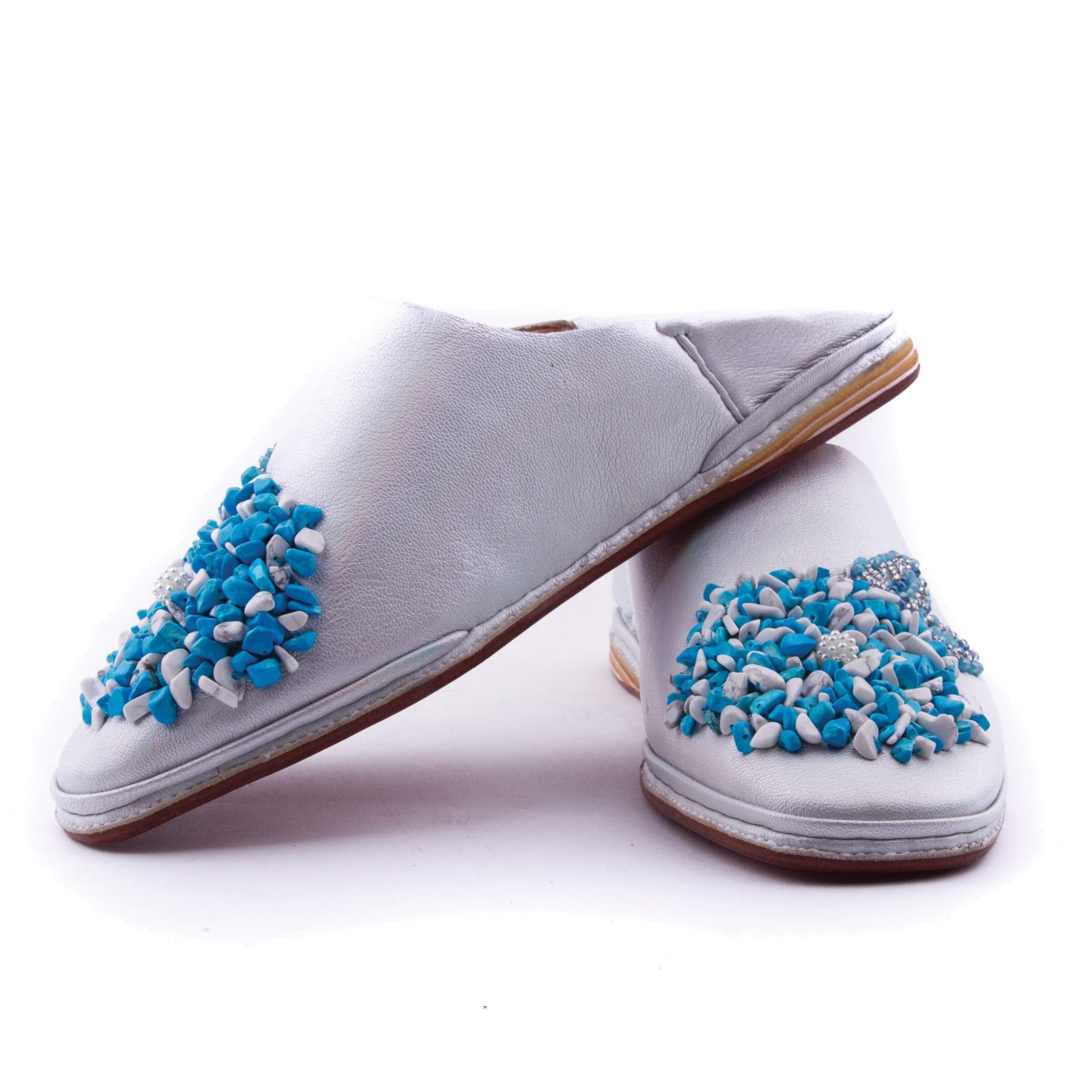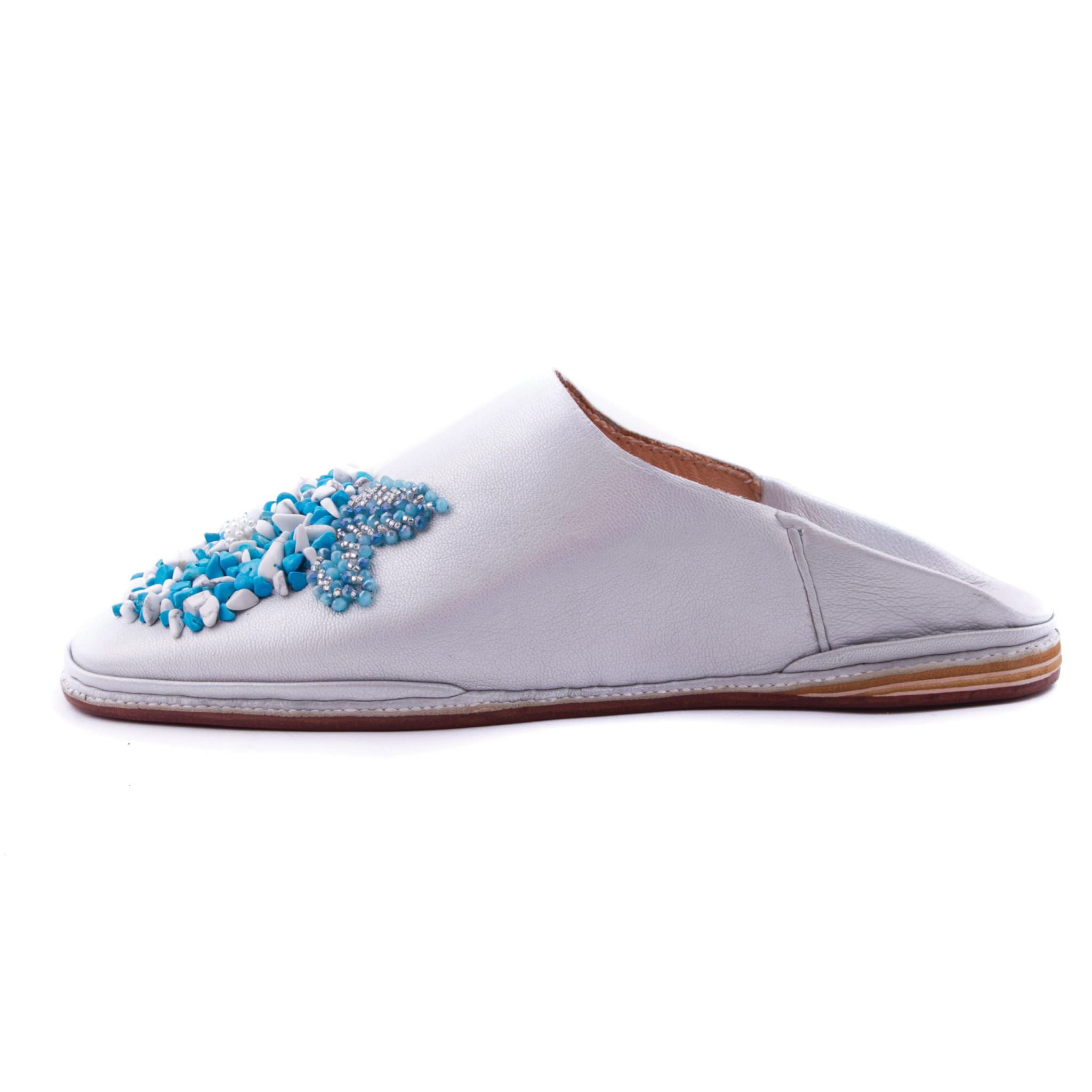 Babouche perlee gris, ornee de perles cousues main. Ideale mariages et ceremonies. Artisanat d'exception de Fes.