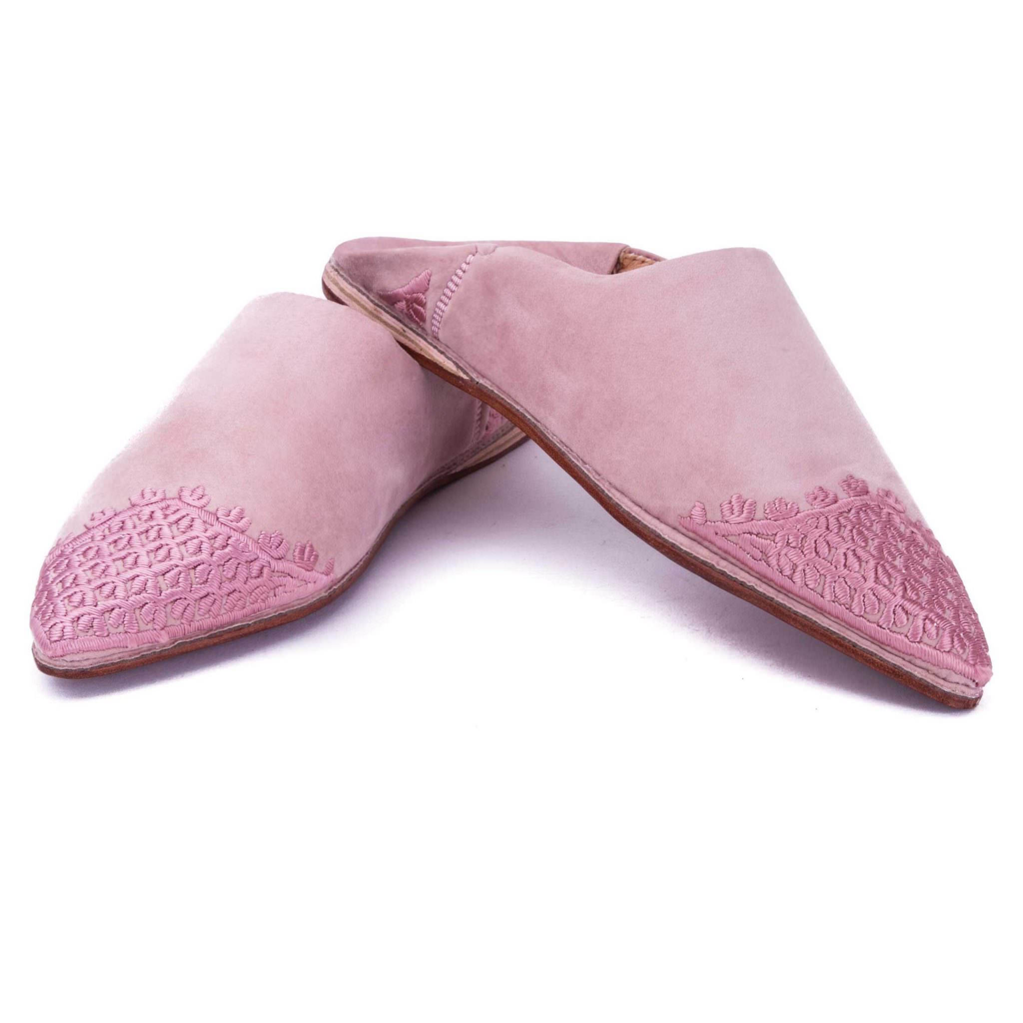 Babouche en velours rose, brodee a la main au fil de soie. Art de la broderie marocaine traditionnelle de Fes.