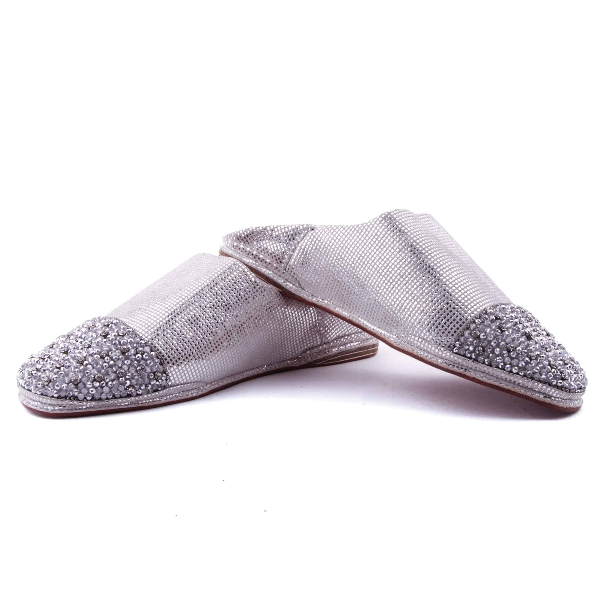Babouche perlee gris, ornee de perles cousues main. Ideale mariages et ceremonies. Artisanat d'exception de Fes.